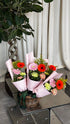 Canlı renkleri ve zarif formuyla enerjik, modern ve neşeli bir mini bukettir. Soft pembe, canlı turuncu ve taze yeşil tonlarının bir araya geldiği bu kompozisyon; doğum günü, teşekkür, kutlama ve kurumsal etkinlikler için ideal bir tercihtir.
